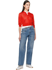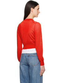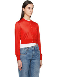Relaxed-fit semi-sheer knit viscose cardigan. · Rib-knit crewneck, hem, and cuffs · Button closure · Embroidered logo patch at chest · Cropped hem · Shell hardware Supplier color: Fiery red