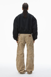 T By Alexander Wang Ruched Track Jacket This black track jacket features gathered seams and a matte logo on the chest to enhance the pleating. This lightweight layered style has a sporty appeal and is detailed with a bungee cord at the hem.