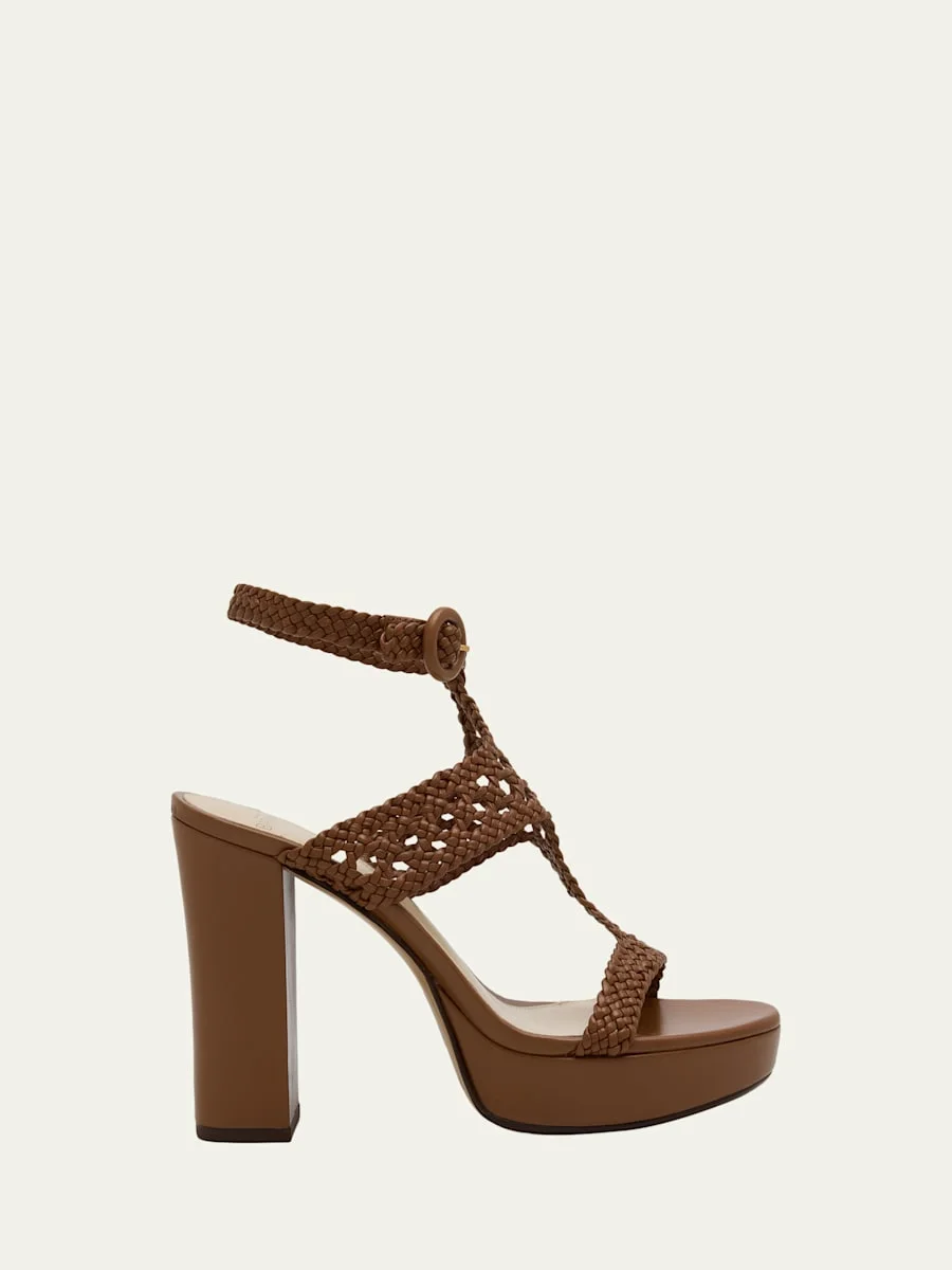 These platform sandals by Alexandre Birman are designed in calfskin leather with a braided upper 4.75 in / 120 mm block heel Open toe Tstrap vamp Adjustable ankle strap Leather lining and outsole Made in Italy