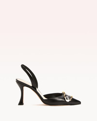 This family is a captivating fusion of classic elegance and sinuous retro design. While their embellishments take inspiration from the graceful curves of streamline modernism, featuring metallic finishes that catch the light and draw attention to their beauty. The heel counts with its sinuous retro shape, adds a touch of vintage allure, reminiscent of an era defined by graceful movement and design. Heel Style: Geometric Heel Heel height: 3.3in | 85mm Pointed Toe Material: Nappa Leather Leather Sole SKU: B0605400030002