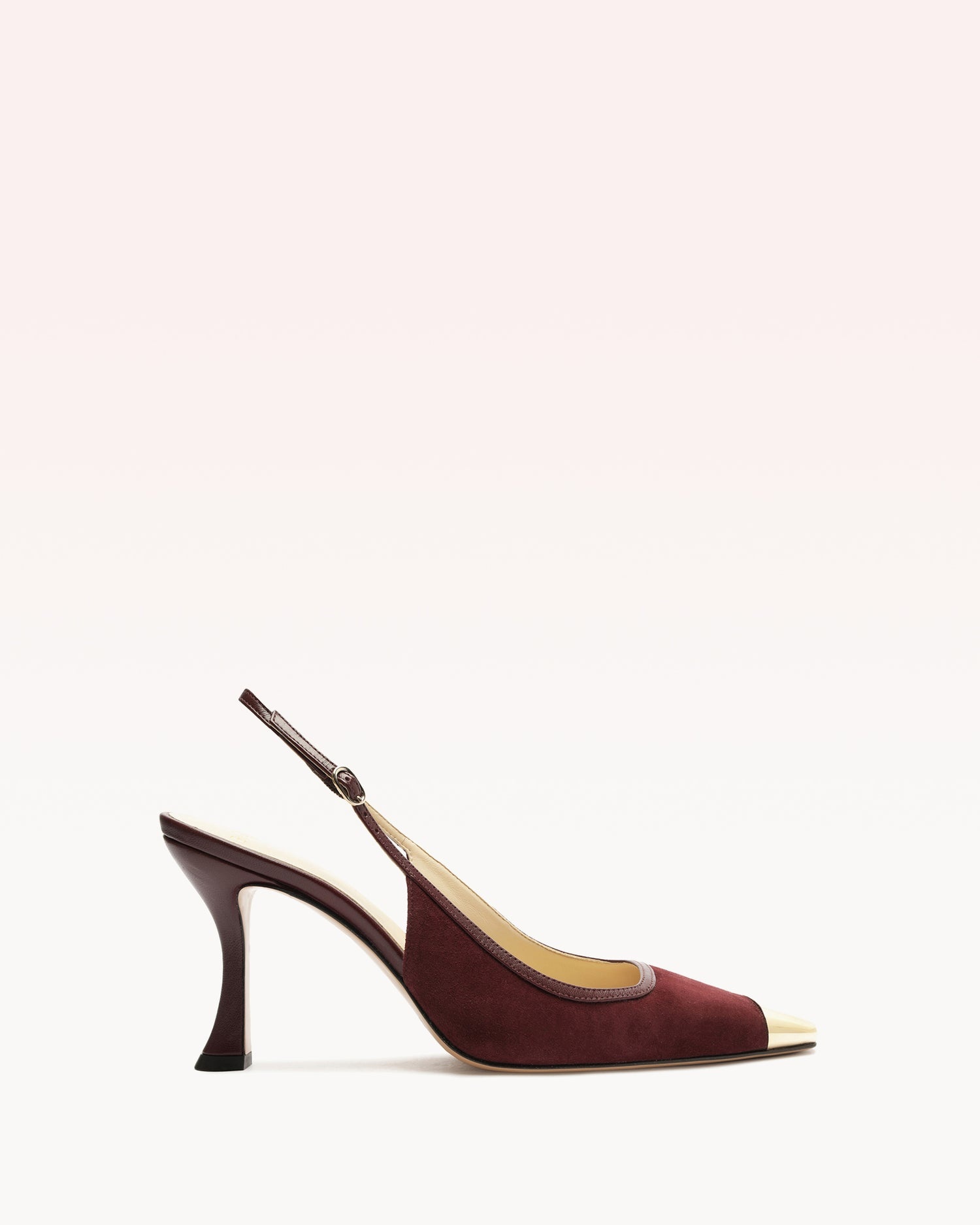 Exhibiting a delicate and alluring design, this Pump style shoe features a longer square toe that exudes elegance, complemented by a metallic captoe in a soft gold hue. The slender strap, fastened delicately with a buckle, ensures a personalized and secure fit. - Material: Suede & Nappa Leather - Leather sole - Square toe - Heel height: 3.4in | 85mm - SKU: B0606300010005