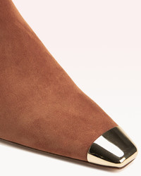 A perfect blend of delicacy and boldness in footwear fashion, these booties boast a slightly elongated squared toe, striking a harmonious balance between modern flair and timeless elegance. The defining feature is the polished metal piece adorning the toe, adding a touch of sophistication and a hint of daring charm to your step. Heel Style: Geometric Heel Heel height: 2.3in | 60mm Square Toe Material: Suede Leather Leather Sole SKU: B0606700010002