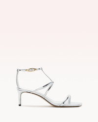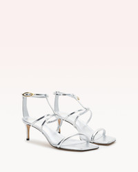 Introducing a seductive sandal with a sleek square toe and a minimalist design. The upper features a single tubular and right above two straps that form an elegant 'X' shape at the front, complemented by a distinctive ankle buckle. The buckle hardware is uniquely designed with an organic, eye-shaped form, polished to perfection for a standout detail. Set on a classic thin heel.Material: Specchio Nappa LeatherLeather SoleHeel Type: Stiletto Heel Height: 0.39 In | 10 mmSKU: B0605100040003