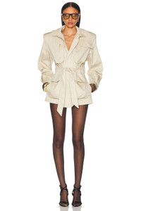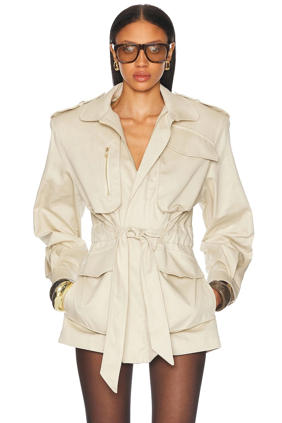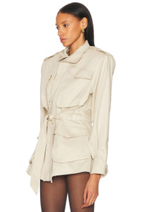 Details - Self: 100% polyester - Lining: 100% polyester - Dry clean only - Hidden front zipper closure - Structured padding at shoulders - Epaulettes and buttoned cuffs - Zipper and flap pockets at breast - Front lower flap pockets - Twill fabric with tie-up accent at waist - Made in Slovak Republic - Our Style No. ALEF-WO54 - Manufacturer Style No. 252JA3108