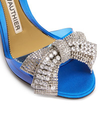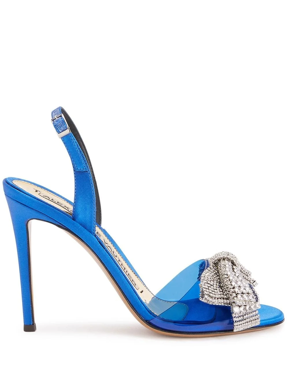 crystal-embellished bow 105mm sandals Highlights - Electric blue - Open toe - Transparent panel detail - Crystal embellishment - Bow detailing - Buckle-fastening slingback strap - 105mm high stiletto heel - Branded leather insole - Leather outsole Made in Italy Composition Other fibres 100% SIZE & FIT Measurement HEEL 4.13 in(10.5 cm)