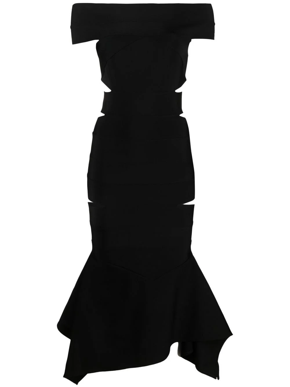 cut-out off-shoulder dress black stretch-design bodycon design cut-out detailing off-shoulder flared hem asymmetric hem handkerchief hem sleeveless rear zip fastening mid-calf length Made in France Composition Viscose 80%, Polyamide 18%, Spandex/Elastane 2% SIZE & FIT Model measurements Height 5 ft 11 in(1.8 m) Bust/Chest 31.88 in(81 cm) Hips 35.03 in(89 cm) Waist 24.01 in(61 cm) FittingInformation This piece fits true to size. We recommend you get your regular size Designed for a close fit at the bust, waist and hips Made with a mid-weight stretch fabric Washing instructions Dry Clean Only