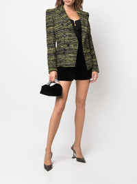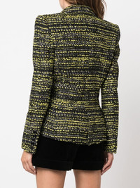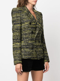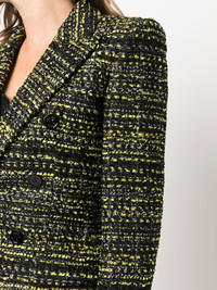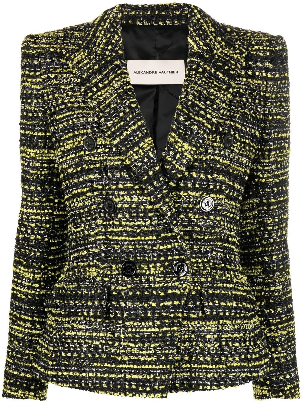 double-breasted tweed blazer double-breasted tweed blazer from ALEXANDRE VAUTHIER featuring black, lemon yellow, tweed, tailored cut, double-breasted button fastening, shoulder pads, notched lapels, long sleeves and straight hem. Imported Composition Outer: Polyamide 52%, Polyester 21%, Viscose 11%, Acrylic 9%, Cotton 4%, Wool 3% Lining: Cupro 100% SIZE & FIT Model measurements Height 5 ft 9 in(1.75 m) Bust/Chest 32.67 in(83 cm) Hips 36.22 in(92 cm) Waist 24.8 in(63 cm) FittingInformation This piece fits true to size. We recommend you get your regular size Cut for a slim fit Made with a mid-weight non-stretch fabric Washing instructions Dry Clean Only