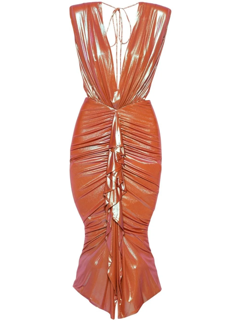 draped-detail dress Highlights - Orange - Metallic sheen - Mesh panelling - Draped detailing - Ruffled detailing - Gathered detailing - V-neck - Shoulder pads - Sleeveless - Open back - Full lining - Rear tie fastening Imported Composition Viscose 100% SIZE & FIT Model measurements Height 5 ft 9 in(1.76 m) Bust/Chest 31.1 in(79 cm) Hips 36.61 in(93 cm) Waist 24.8 in(63 cm)