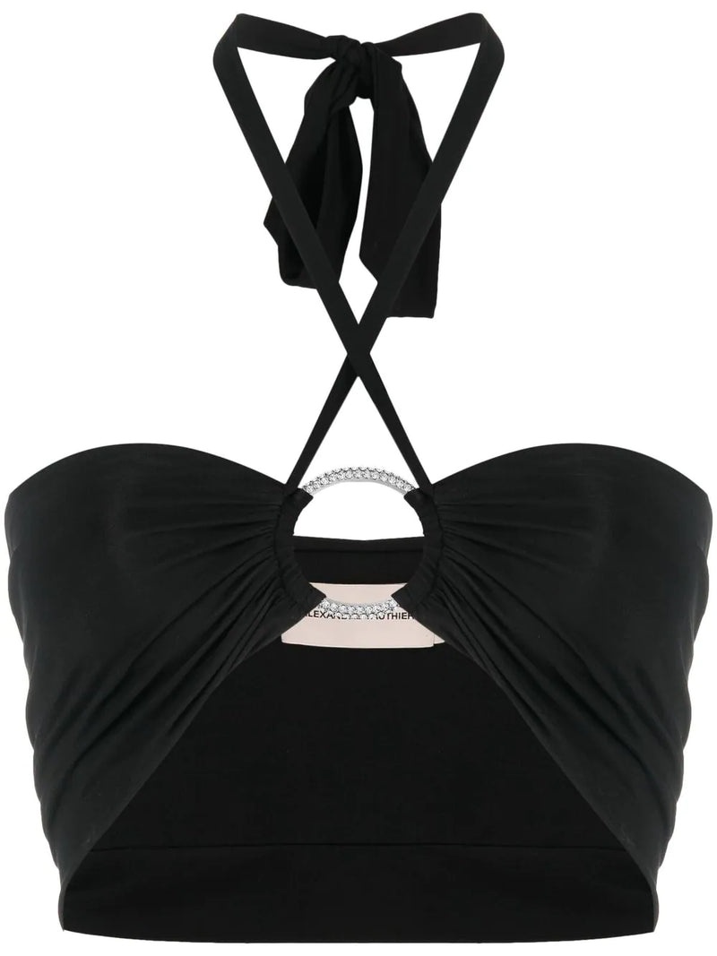 ALEXANDRE VAUTHIER embellished-ring halterneck crop top embellished-ring halterneck crop top from ALEXANDRE VAUTHIER featuring black, stretch-design, ring hardware detailing, rhinestone embellishment, ruched detailing, halterneck tie fastening, crossover neck, sleeveless and cropped. Composition Brass 100%, Glass 100%, Viscose 92%, Spandex/Elastane 8% Washing instructions Dry Clean Only Wearing The model is 1.76 m wearing size 36