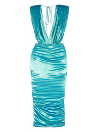foiled drape-detailing dress Highlights - Turquoise blue-green - Foiled finish - Draped detailing - Ruffled detailing - Mesh panelling to the sides - Plunging v-neck - Open back - Shoulder pads - Sleeveless - Front slit - Rear tie fastening - Mid-length - Double layer Imported Composition Viscose 100% SIZE & FIT Model measurements Height 5 ft 9 in(1.76 m) Bust/Chest 31.1 in(79 cm) Hips 36.61 in(93 cm) Waist 24.8 in(63 cm)