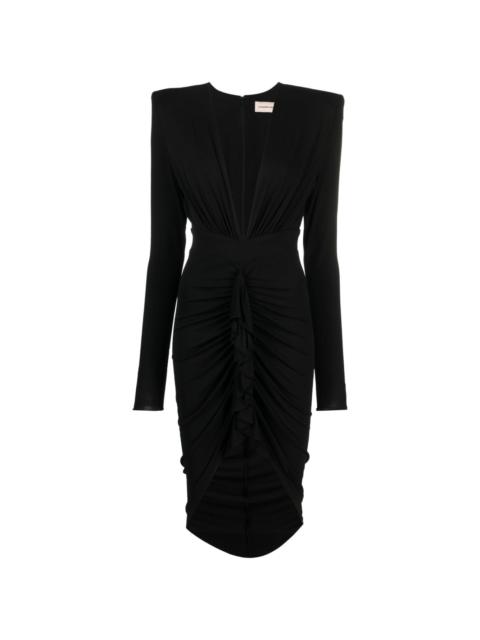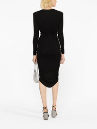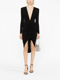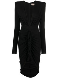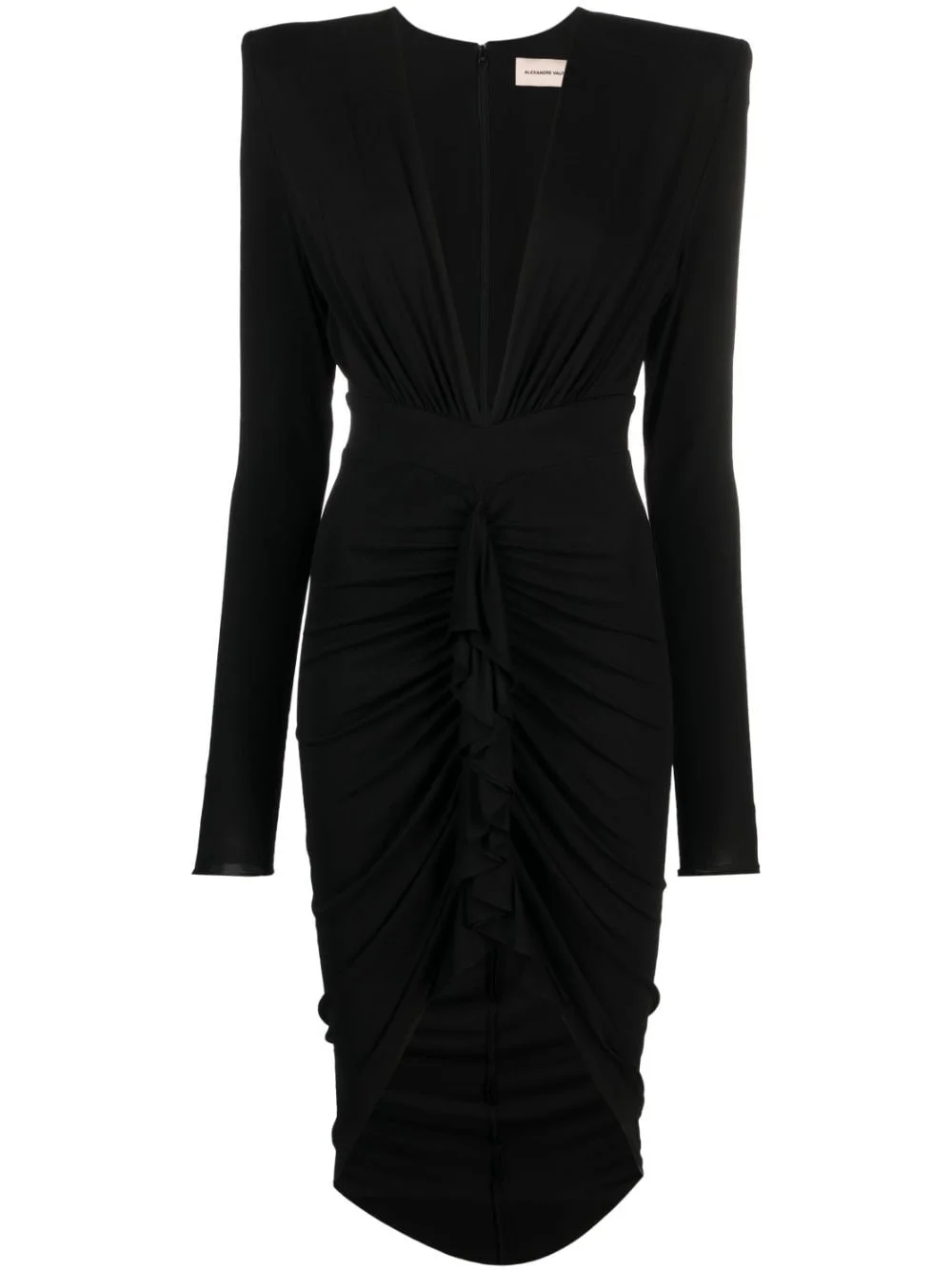 gathered midi dress Alexandre Vauthier marries striking materials with precise tailoring with this black dress from its AW23 collection. The mid-length silhouette falls to a draped skirt that gathers at the centre, creating an asymmetric hem. Highlights - Black - Stretch-design - Gathered detailing - Ruffled trim - Plunging v-neck - Shoulder pads - Long sleeves - Rear zip fastening - Mid-length - Asymmetric hem Imported Composition Viscose 92%, Elastane 8% SIZE & FIT Model measurements Height 5 ft 10 in(1.79 m) Bust/Chest 31.49 in(80 cm) Hips 35.03 in(89 cm) Waist 23.62 in(60 cm) FittingInformation Designed for a close fit throughout Made from a midweight stretch fabric, this piece offers elasticity and flexibility when worn This piece fits true to size – take your usual size Washing instructions Dry Clean Only