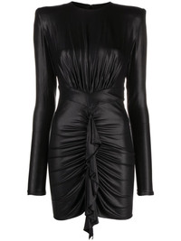 gathered ruffled satin-jersey minidress Eponymous designer Alexandre Vauthier says his AW23 collection is a ‘quest for balance, for grounding my work in its essential foundations.’ The result is pieces like this black satin-jersey dress. It’s crafted to a signature strong-shouldered silhouette in structural contrast to the soft gathers and ruffled trim. Highlights - Black - Stretch-jersey - Satin finish - Ruffled detailing - Gathered detailing - Crew neck - Concealed rear zip fastening - Long sleeves - Thigh-length - Asymmetric hem Imported Composition Viscose 93%, Spandex/Elastane 7% SIZE & FIT Model measurements Height 5 ft 11 in(1.8 m) Bust/Chest 34.25 in(87 cm) Hips 35.82 in(91 cm) Waist 24.8 in(63 cm) Measurement LENGTH 32.67 in(83 cm) WAIST 23.62 in(60 cm) HIPS 32.28 in(82 cm) FittingInformation Designed for a close fit throughout The internal shoulder pads offer a structured shape Made from a midweight stretch fabric, this piece offers elasticity and flexibility when worn This piece fits true to size – take your usual size