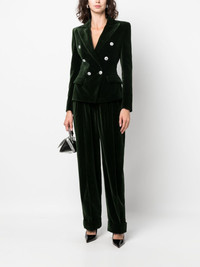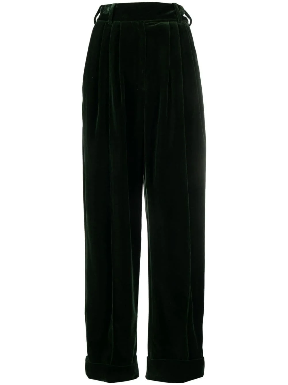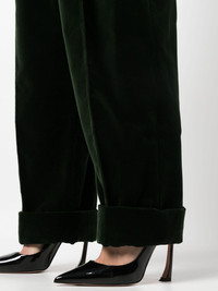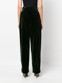 high-waisted velvet trousers Highlights - Dark green - Cotton - Velvet - Pleat detailing - Straight leg - High-waisted - Belt loops - Two side slit pockets - Pressed crease - Turn-up hem Imported Composition Cotton 100% SIZE & FIT Model measurements Height 5 ft 9 in(1.76 m) Bust/Chest 33.07 in(84 cm) Hips 34.64 in(88 cm) Waist 25.59 in(65 cm) FittingInformation Designed for a tapered fit, these trousers allow for a close fit at the waist and a loose unrestricted fit over the leg with a closer fit towards the ankle Made from a midweight non-stretch fabric This piece fits true to size – take your usual size Washing instructions Dry Clean Only