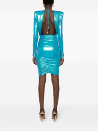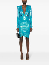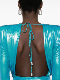 azure blue laminated finish mesh panelling gathered detailing draped detailing plunging V-neck long sleeves shoulder pads open back mid-calf length curved hem rear drawstring fastening with crystal embellishment Size & Fit Model Measurements: Height: 1.81 m Bust/Chest: 83.0 cm Hips: 90.0 cm Waist: 60.0 cm Model wears size 36 Fabric and Care Designer Style ID: 241DR2064 Designer Colour: 2064-241 TURQUOISE Composition: Viscose 100% Washing instructions: Dry Clean Only Made in Portugal