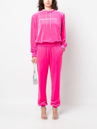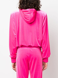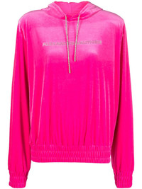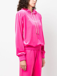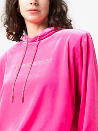 logo-applique velvet hoodie Highlights - Fluorescent pink - Velvet - Applique logo - Glass crystal embellishment - Drawstring hood - Drop shoulder - Long sleeves - Elasticated cuffs - Elasticated hem Made in Italy Composition Outer: glass 100%, Polyester 90%, Elastane 10% Lining: Polyester 88%, Elastane 12% SIZE & FIT Model measurements Height 5 ft 9 in(1.76 m) Bust/Chest 33.07 in(84 cm) Hips 34.64 in(88 cm) Waist 25.59 in(65 cm) FittingInformation Designed to be unstructured, offering a loose fit throughout The internal shoulder pads offer a structured shape Made from a midweight stretch fabric, this piece offers elasticity and flexibility when worn This piece fits true to size – take your usual size Washing instructions Dry Clean Only