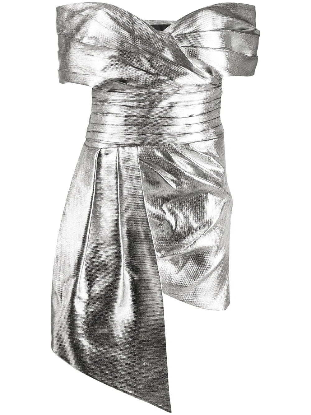 off-the-shoulder draped mini dress Highlights - Silver-tone - Off-the-shoulder - Draped design - Sweetheart neck - Asymmetric hem - Ribbed waistband Imported Composition Outer: Polyamide 96%, Silk 4% Lining: Polyester 100% SIZE & FIT Model measurements Height 5 ft 9 in(1.75 m) Bust/Chest 32.67 in(83 cm) Hips 36.22 in(92 cm) Waist 24.8 in(63 cm) Measurement HIPS 36.22 in(92 cm) LENGTH 39.37 in(100 cm) WAIST 26.37 in(67 cm) BUST 30.31 in(77 cm) FittingInformation This piece fits true to size. We recommend you get your regular size Cut for a slim fit Made with a mid-weight non-stretch fabric Washing instructions Dry Clean Only