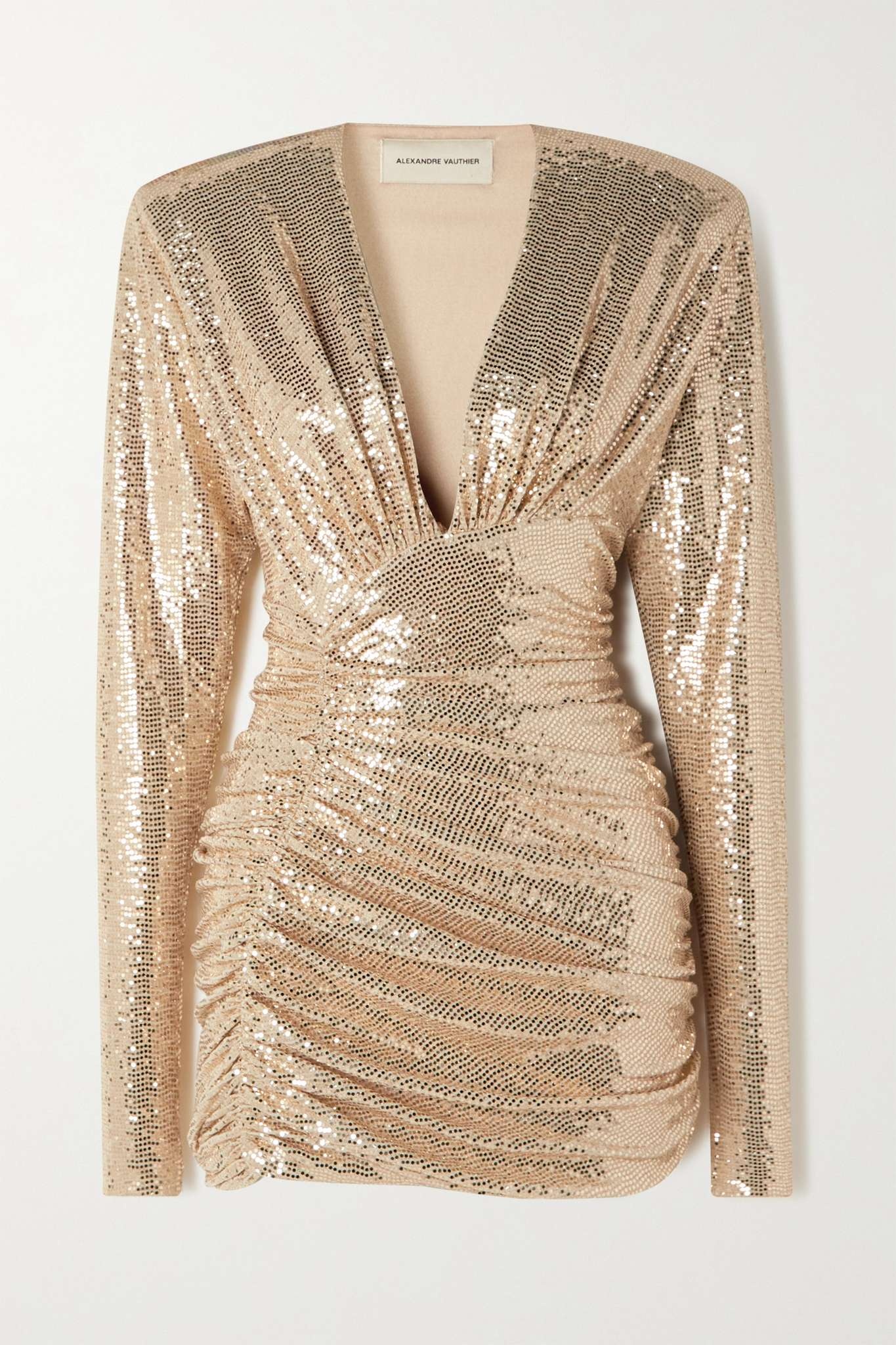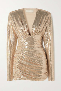 EDITORS'NOTES Alexandre Vauthier's high-octane dresses are a celebrity favorite and this sequined mini will ensure your style shines to an A-list level. It's cut for a very close fit from stretch-jersey and has shoulder pads for a sense of '80s power dressing. The signature gathering exudes <i>all-eyes-on-you</i> glamour. SIZE & FIT - DETAILS & CARE - Sand and gold sequined stretch-jersey - Concealed zip fastening along side - 87% polyamide, 8% polyester, 5% elastane; lining: 95% polyester, 5% elastane - Specialist clean