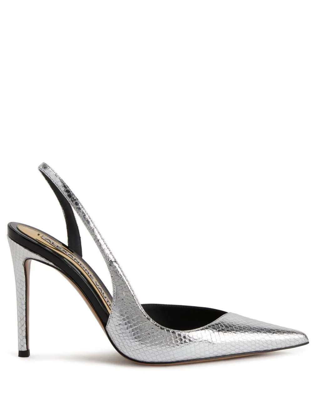 snakeskin-effect 105mm leather pumps Embracing Alexandre Vauthier's love for metallic leather, these Avi pumps arrive in a silver-tone lizard-embossed silhouette. A slingback strap brings stability to the pair, while the 105mm heels elevate the design Highlights - Silver-tone - Leather - Snakeskin effect - Slingback strap - High stiletto heel - Branded footbed - Pointed toe Made in Italy Composition Sole: Leather 100% Outer: Polyurethane 43%, Thermoplastic Polyurethane (TPU) 19%, Resin 8% Lining: Leather 100% SIZE & FIT Measurement HEEL 4.13 in(10.5 cm)