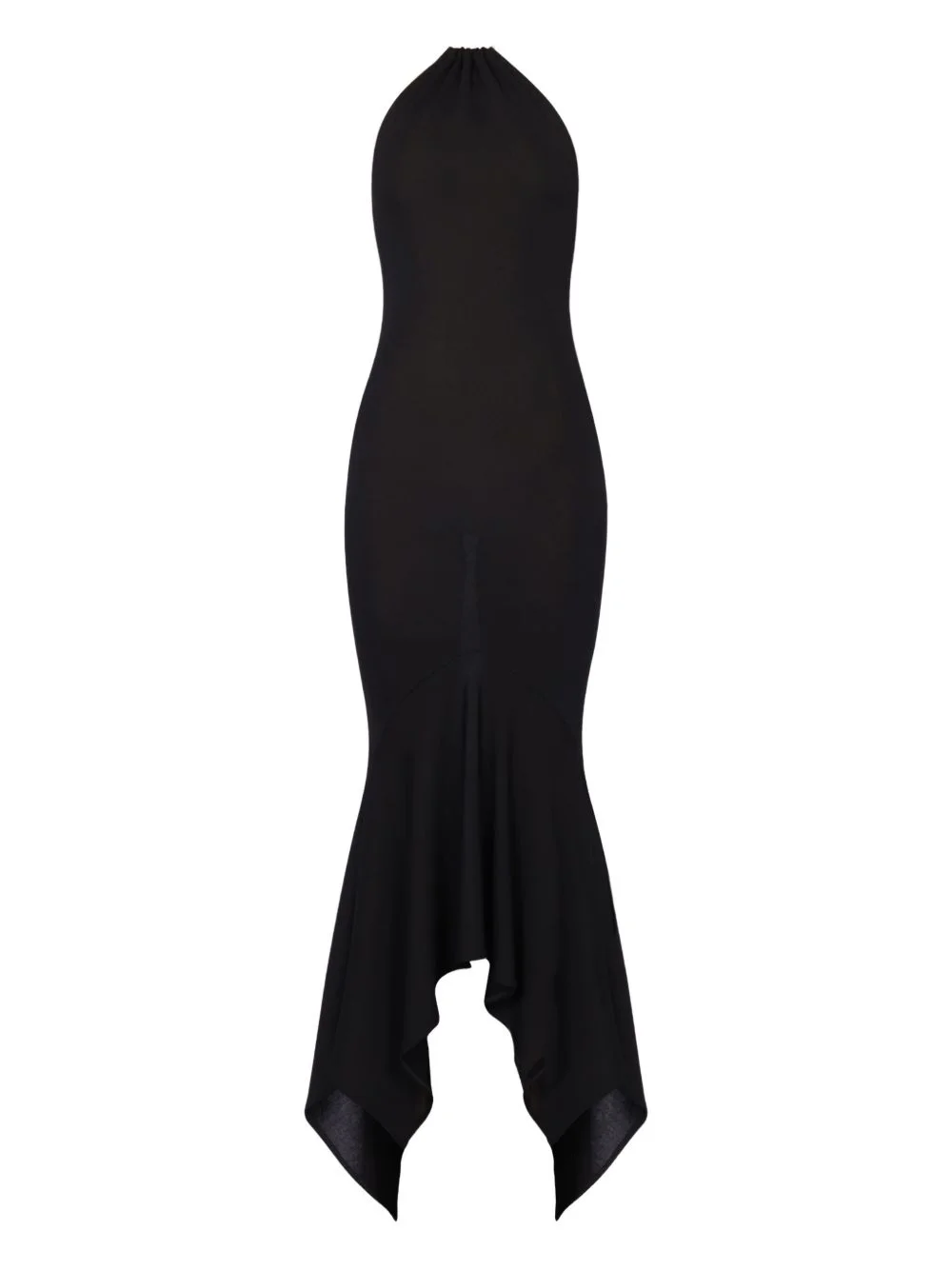 crystal-embellished halterneck dress Highlights - Black - Crystal embellishment - Halterneck tie fastening - Sleeveless - Open back - Trumpet silhouette - Asymmetric hem Made in France Composition Viscose 76%, Polyamide 24% Washing instructions Read Manufacturer Guidelines