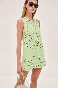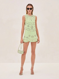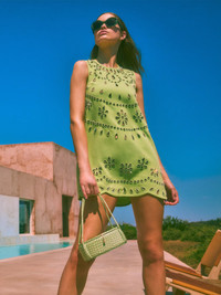 Effortless and chic, the Adilyn Dress features intricate laser-cut details and a vibrant green color for a playful twist. Its A-line silhouette and scalloped edges add a flattering, feminine touch, making it perfect for any occasion. Model Measurements Height: 5'11" Bust: 32 Waist: 24" Hips: 34” Model wears XS.