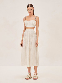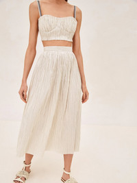 The Rezza Skirt offers effortless sophistication. Its pleated construction and comfortable fit make it a go-to for a quick style upgrade. The midi length allows for versatility, whether worn with the Nora Top or a casual tee. It's a skirt that simplifies your wardrobe; just slip it on and you're ready to take on the day. Model Measurements Height: 5'10" Bust: 34B Waist: 25" Hips: 35” Model wears an XS