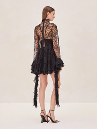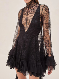 Introducing the Aliya Mini Lace Turtleneck Dress—a stunning blend of vintage charm and modern flair. This dress features intricate lace detailing and a high neckline that exudes elegance, while the mini length adds a playful, flirtatious touch. The cascading ruffle detail along the sleeves and hem adds a dramatic flair, making every movement feel like a moment.The Aliya dress effortlessly combines sophistication with a bit of edge. Whether you're pairing it with knee-high boots or your favorite heels, this dress is a statement piece that will have all eyes on you. Model wears XS Model Measurements Height: 5'10" Bust: 34B Waist: 25" Hips: 35”