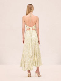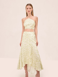 The Alzena Skirt is a high-low wrap silhouette featuring an abstract print, paired with the Nali Top. Model Measurements Height: 5'10" Bust: 34B Waist: 25" Hips: 35” Model wears an XS