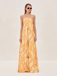 The Amalfi dress features a flowing maxi silhouette with a vibrant, amber lily print. The twisted halter neckline adds a unique, elevated touch, while the lightweight fabric ensures comfort and movement. Model Measurements Height: 5'11" Bust: 32 Waist: 24" Hips: 34” Model wears XS.