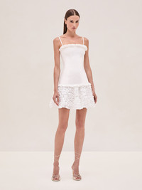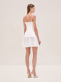 The Amrisa Dress is a floral applique mini dress, featuring intricate fabric florals at the hem. Model Measurements Height: 5'10" Bust: 34B Waist: 25" Hips: 35” Model wears an XS