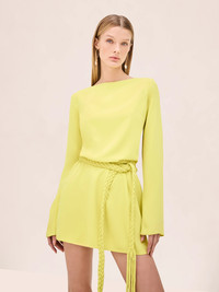 The Angelie Dress is a long sleeve mini dress featuring a bateau neckline and a braided wrap belt. Model Measurements Height: 5'10" Bust: 34B Waist: 25" Hips: 35” Model wears an XS