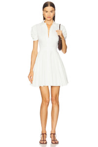 - 53% cotton 43% viscose 4% elastane - Dry clean only - Unlined - Front button closure - Ruched puff sleeves - Crisp poplin fabric with pleated skirt and side seam pockets - Revolve Style No. AXIS-WD893 - Manufacturer Style No. A1250335-0600