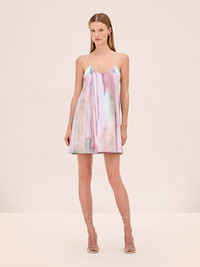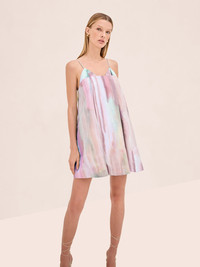 The Astrid Dress is a spaghetti strap mini silhouette featuring a soft watercolor-inspired print. Read more Model Measurements Height: 5'10" Bust: 34B Waist: 25" Hips: 35” Model wears an XS Read more