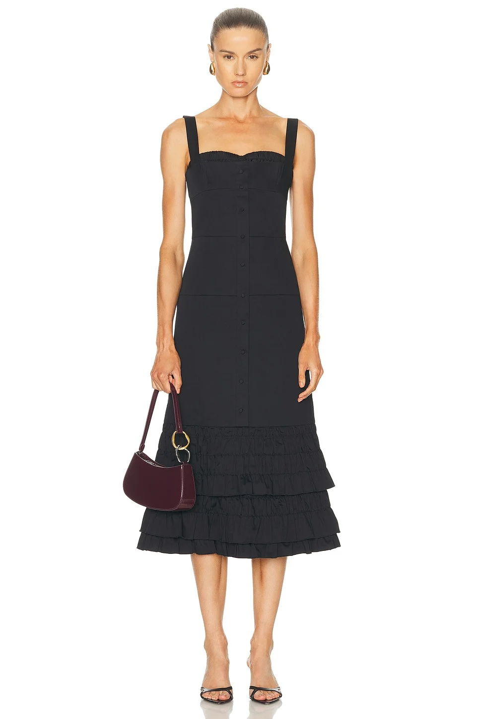 Details - Self: 97% cotton, 3% elastane - Lining & Contrast Fabric: 54% polyester, 46% rayon - Dry clean only - Fully lined - Hidden side zip closure - Front tonal button detailing - Tiered ruffle skirt - Heavyweight poplin fabric - Made in China - Our Style No. ALXF-WD586 - Manufacturer Style No. A1240435-0399