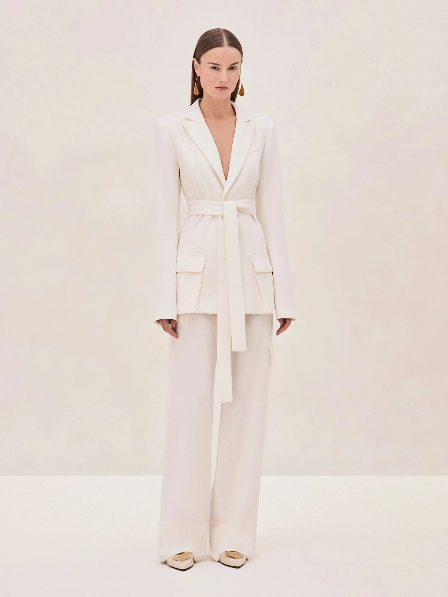 The Bartan Jacket features a sleek, structured design, perfectly balanced with a self-tie belt that cinches the waist, offering a flattering silhouette. The large utility pockets add a modern twist, making it as functional as it is fashionable.Pair the Bartan Jacket with the Justen Pant for a coordinated look that exudes sophistication. Together, they create a powerful, yet elegant outfit that transitions effortlessly from the office to evening events. Model wears XS Model Measurements Height: 5'10" Bust: 34B Waist: 25" Hips: 35” Model wears an XS