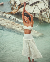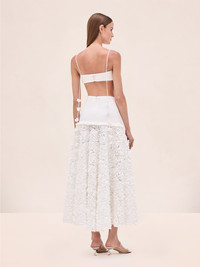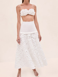 The Bria Skirt is a stretch cotton skirt featuring an embroidered 3D petal tier at the hem, paired with the Risi Top. Model Measurements Height: 5'10" Bust: 34B Waist: 25" Hips: 35” Model wears an XS