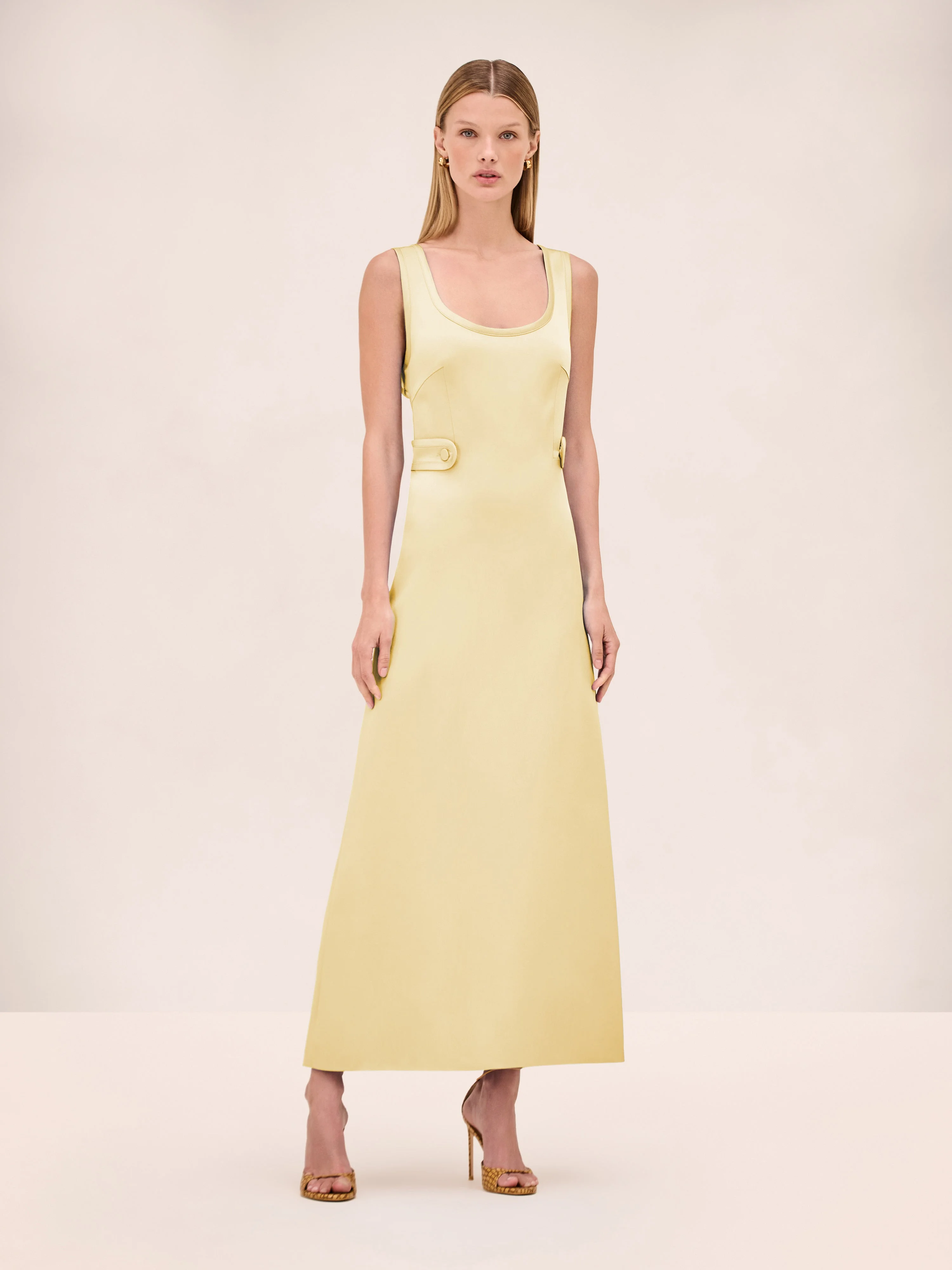 The Briette Dress is a scoop neck silhouette featuring side tab detailing and a clean, streamlined fit. Read more Model Measurements Height: 5'10" Bust: 34B Waist: 25" Hips: 35” Model wears an XS Read more