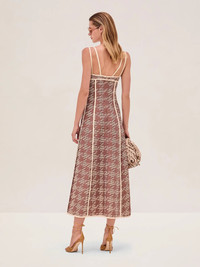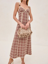 The Bronzen Dress is a midi featuring a classic houndstooth woven print with modern detailing. Designed with thin double straps adorned with statement hardware, a structured bodice, and contrast piping that accentuates its silhouette. Model Measurements Height: 5'11" Bust: 32 Waist: 24" Hips: 34” Model wears XS.