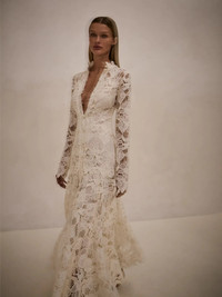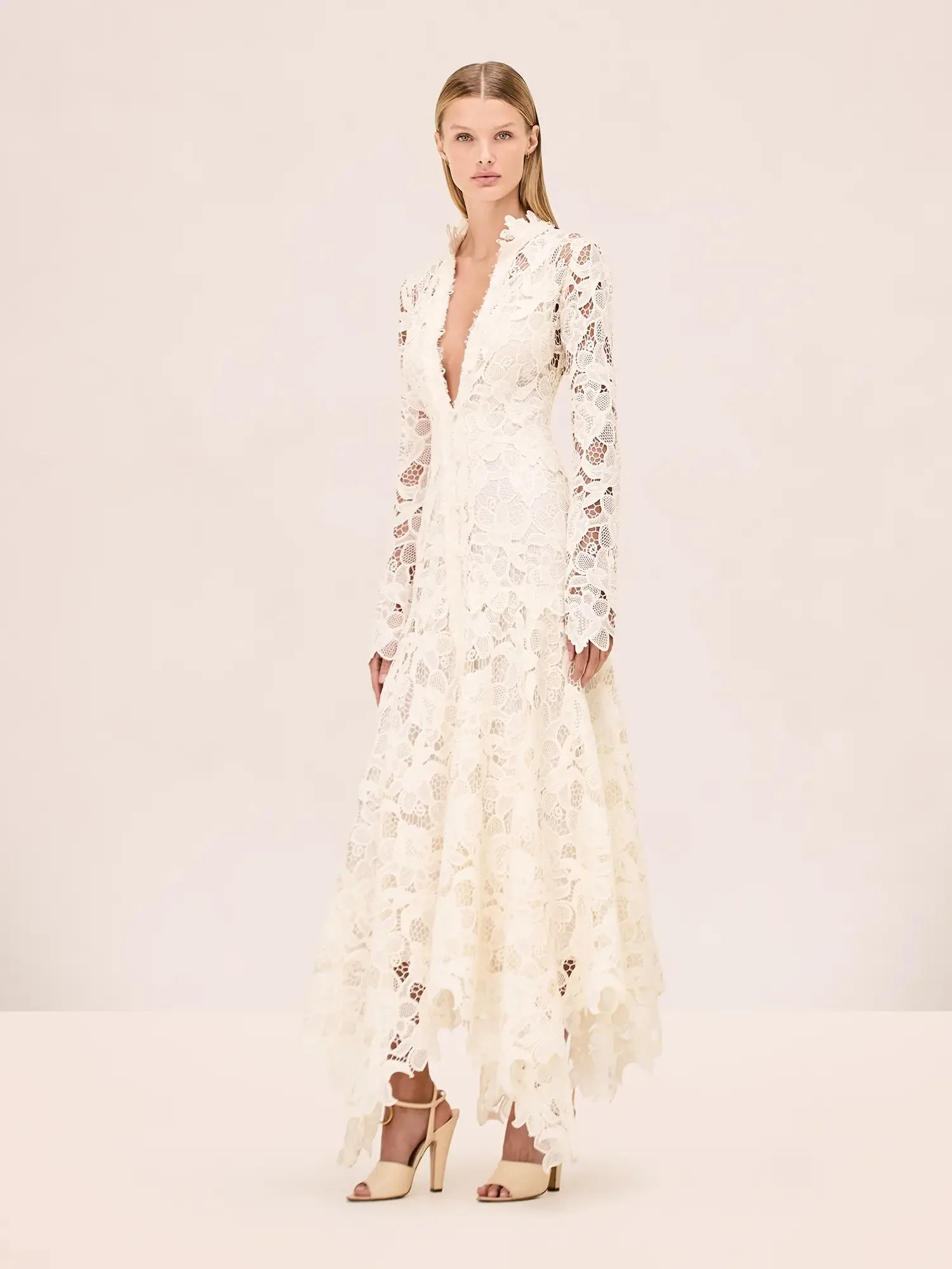 The Camila Dress is a long sleeve midi silhouette crafted in floral lace, featuring a plunging neckline Model Measurements Height: 5'10" Bust: 34B Waist: 25" Hips: 35” Model wears an XS