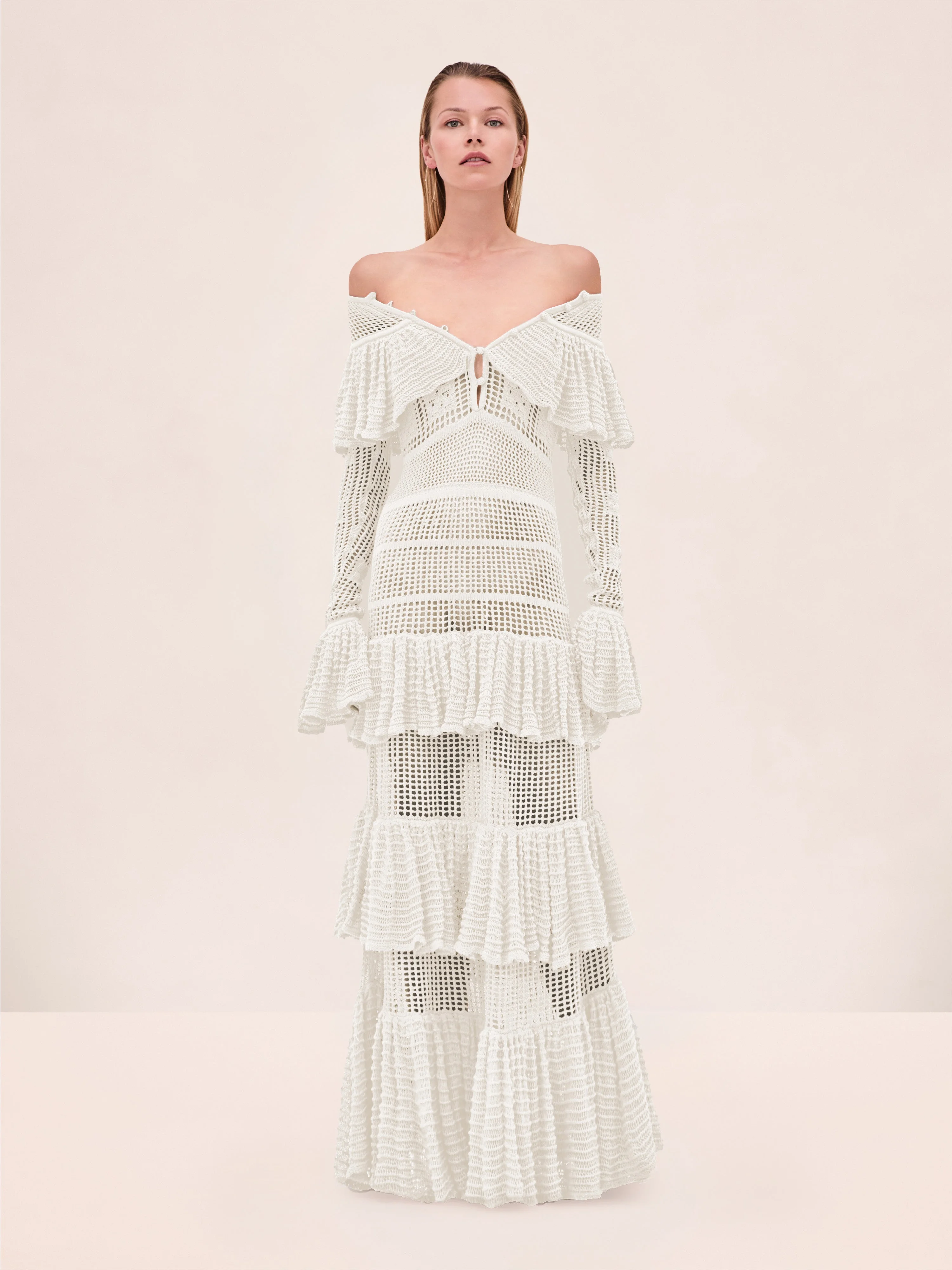 The Carmen Dress is an off-the-shoulder ruffled knit dress designed with intricate openwork detailing and cascading tiered ruffles. Model Measurements Height: 5'10" Bust: 34B Waist: 25" Hips: 35” Model wears an XS