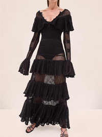 The Carmen Dress is an off-the-shoulder ruffled knit dress designed with intricate openwork detailing and cascading tiered ruffles. Model Measurements Height: 5'10" Bust: 34B Waist: 25" Hips: 35” Model wears an XS