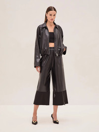 The Channing Jacket is a relaxed zip-front style with a pointed collar, paired with the wide-leg Jacob Pant. Model Measurements Height: 5'10" Bust: 34B Waist: 25" Hips: 35” Model wears an XS