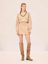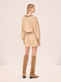 The Colby Dress is a fitted knit mini dress with long sleeves and a deep v-neckline, finished with a contrast trim detail at the collar. Model Measurements Height: 5'10" Bust: 34B Waist: 25" Hips: 35” Model wears an XS