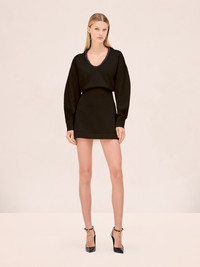 The Colby Dress is a fitted knit mini dress with long sleeves and a deep v-neckline, finished with a contrast trim detail at the collar. Model Measurements Height: 5'10" Bust: 34B Waist: 25" Hips: 35” Model wears an XS