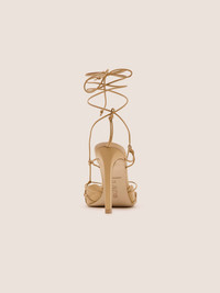The Collette Sandal features a refined strappy design with delicate leather laces that wrap gracefully around the ankle for a customizable fit. Elevated by a sleek stiletto heel, it exudes a perfect balance of modern elegance and timeless sophistication. Details 4.5" heel height Upper: 100% Goat Leather, Lining: 100% Goat Leather, Outsole: 100% Leather