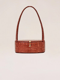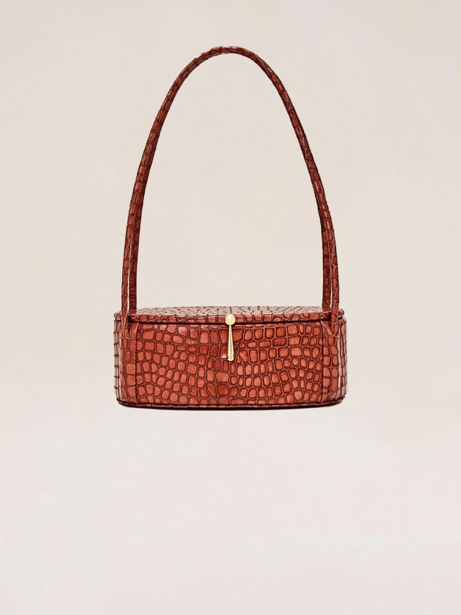The Constance is a petite oval, top-handle handbag crafted featuring a lock closure. Designed with both style and functionality in mind, it also includes a built-in mirror inside for effortless touch-ups on the go. Model Measurements Height: 5'10" Bust: 34B Waist: 25" Hips: 35” Model wears an XS