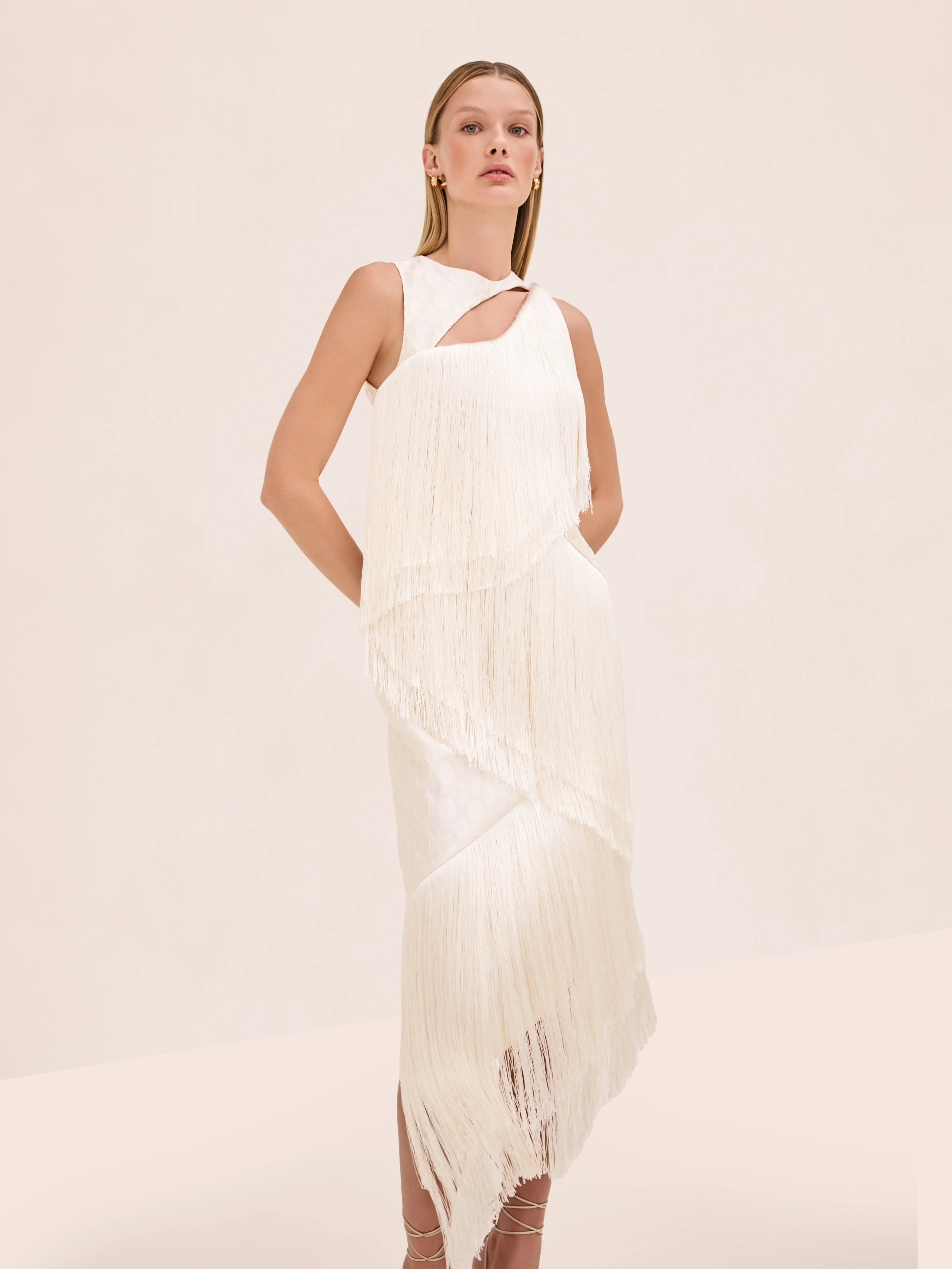 The Costa Dress is a sleeveless silhouette featuring fringe detailing and an asymmetric hem. Model Measurements Height: 5'10" Bust: 34B Waist: 25" Hips: 35” Model wears an XS