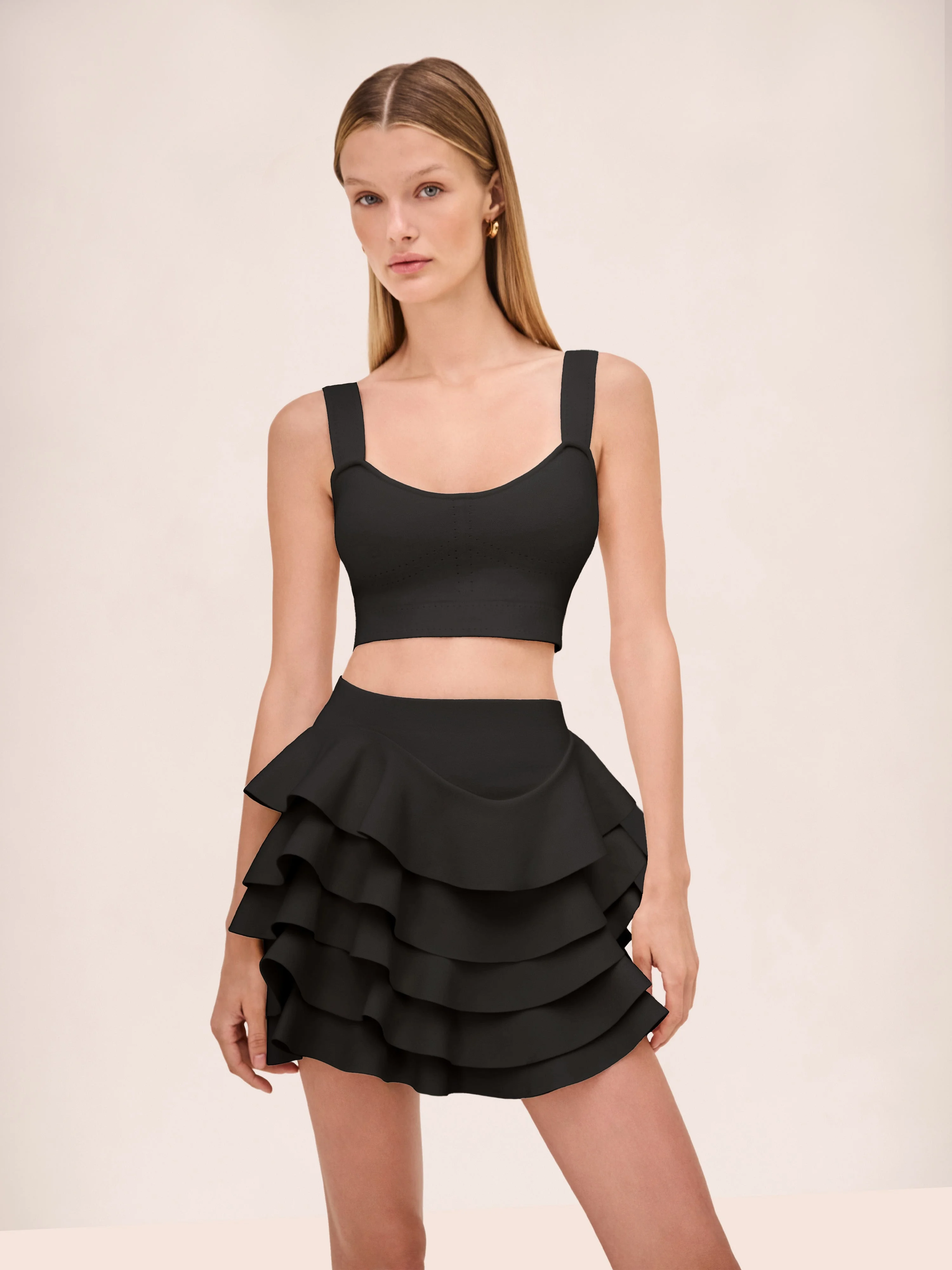 The Dee Top is a structured cropped top design, paired with the Arli Skirt. Model Measurements Height: 5'10" Bust: 34B Waist: 25" Hips: 35” Model wears an XS