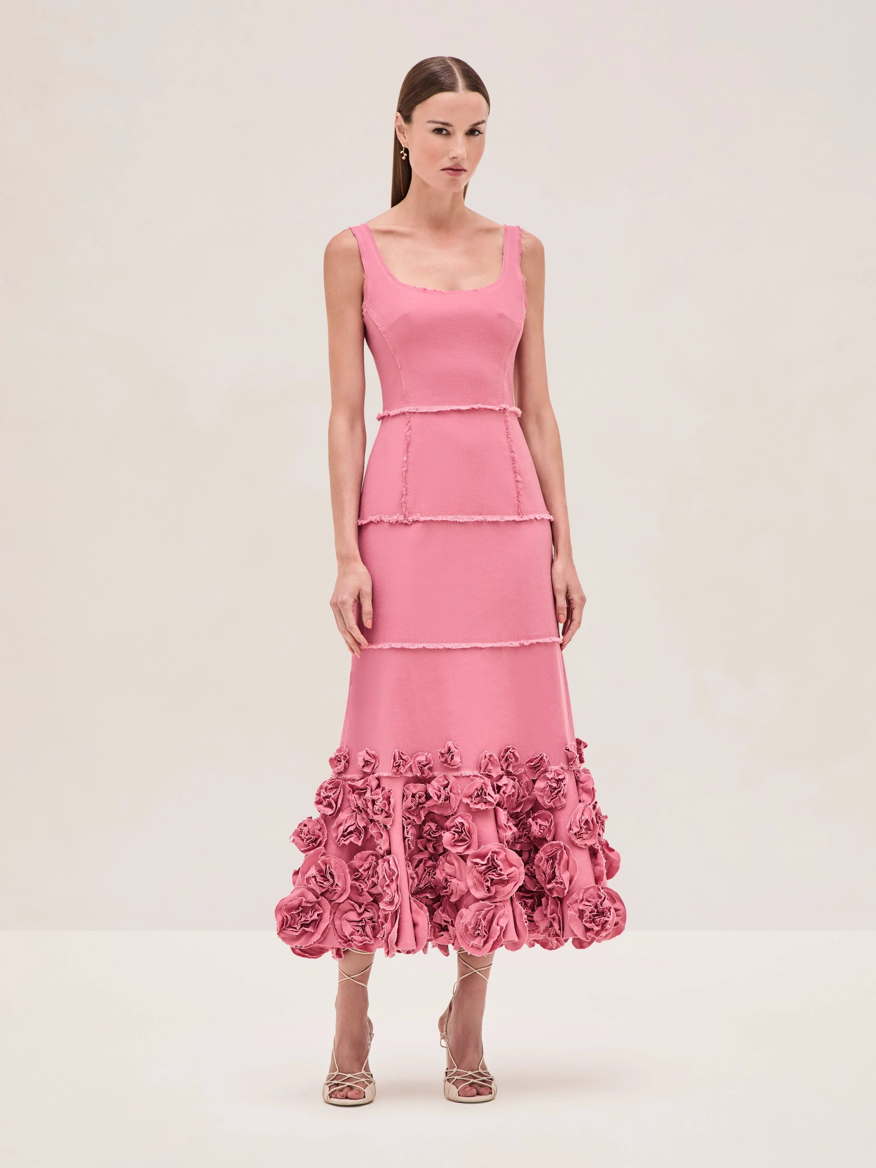 The Demina Dress is a cotton midi featuring raw edge geometric appliques and fringed seam construction. Model Measurements Height: 5'11" Bust: 32 Waist: 24" Hips: 34” Model wears XS.