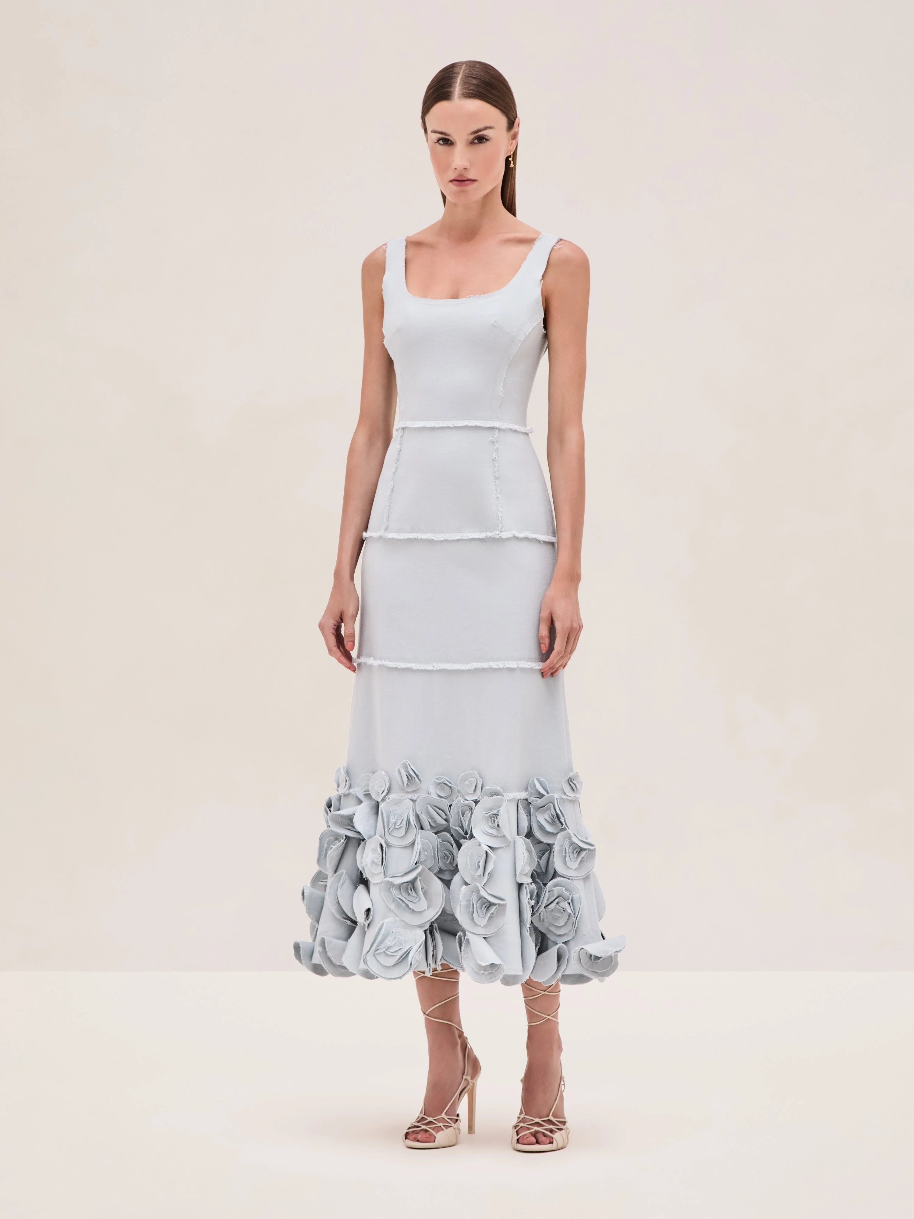 The Demina Dress is a cotton midi featuring raw edge geometric appliques and fringed seam construction. Model Measurements Height: 5'10" Bust: 34B Waist: 25" Hips: 35” Model wears an XS