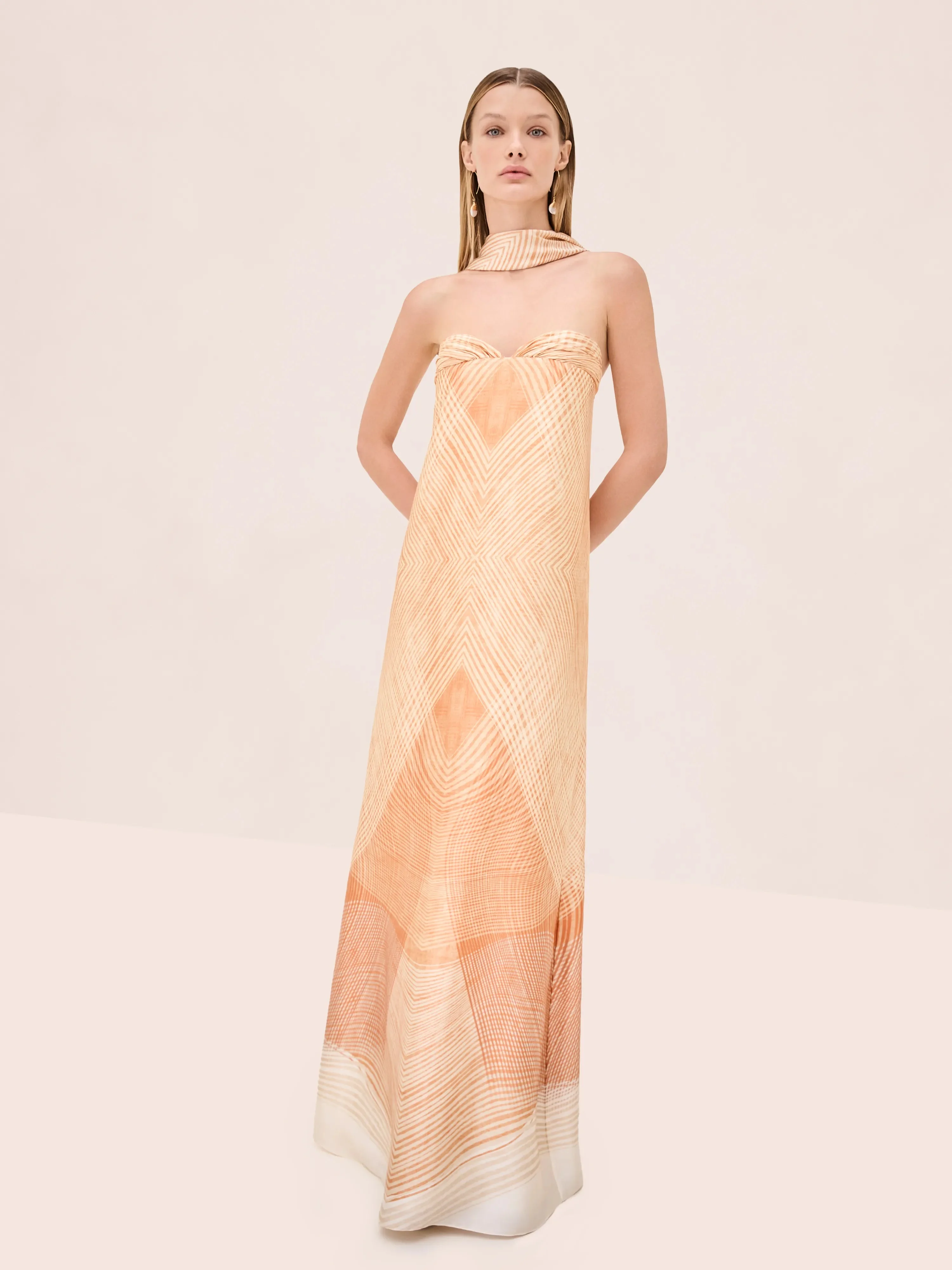 The Dianne Dress is a strapless satin maxi silhouette featuring sculpted bust cups, a mirrored geometric print, and an adjustable back tie. Model Measurements Height: 5'10" Bust: 34B Waist: 25" Hips: 35” Model wears an XS
